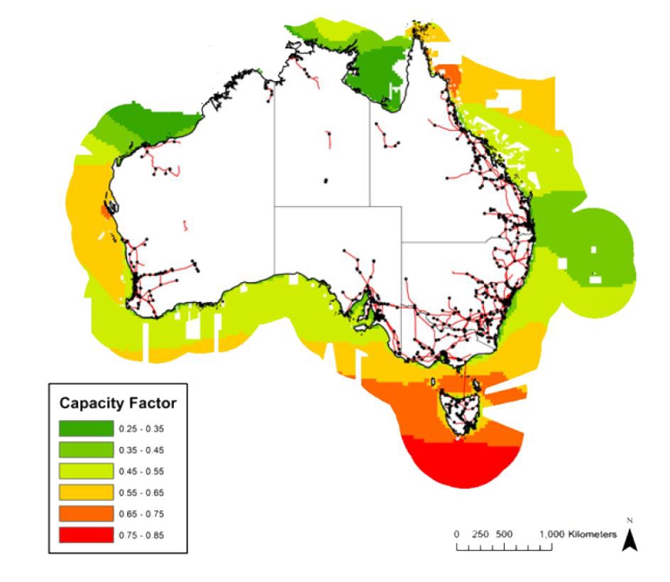 Several potentially favorable sites for offshore wind exist, encompassing Western and southwest regions of Western Australia, marked by quality winds in coastal shallows; a limited northern Queensland zone with notably high capacity factors; and locations off the coastlines of New South Wales and Queensland. Numerous excellent spots align with significant industrial hubs like Port Kembla, Newcastle, Gladstone, and the southern part of Perth.